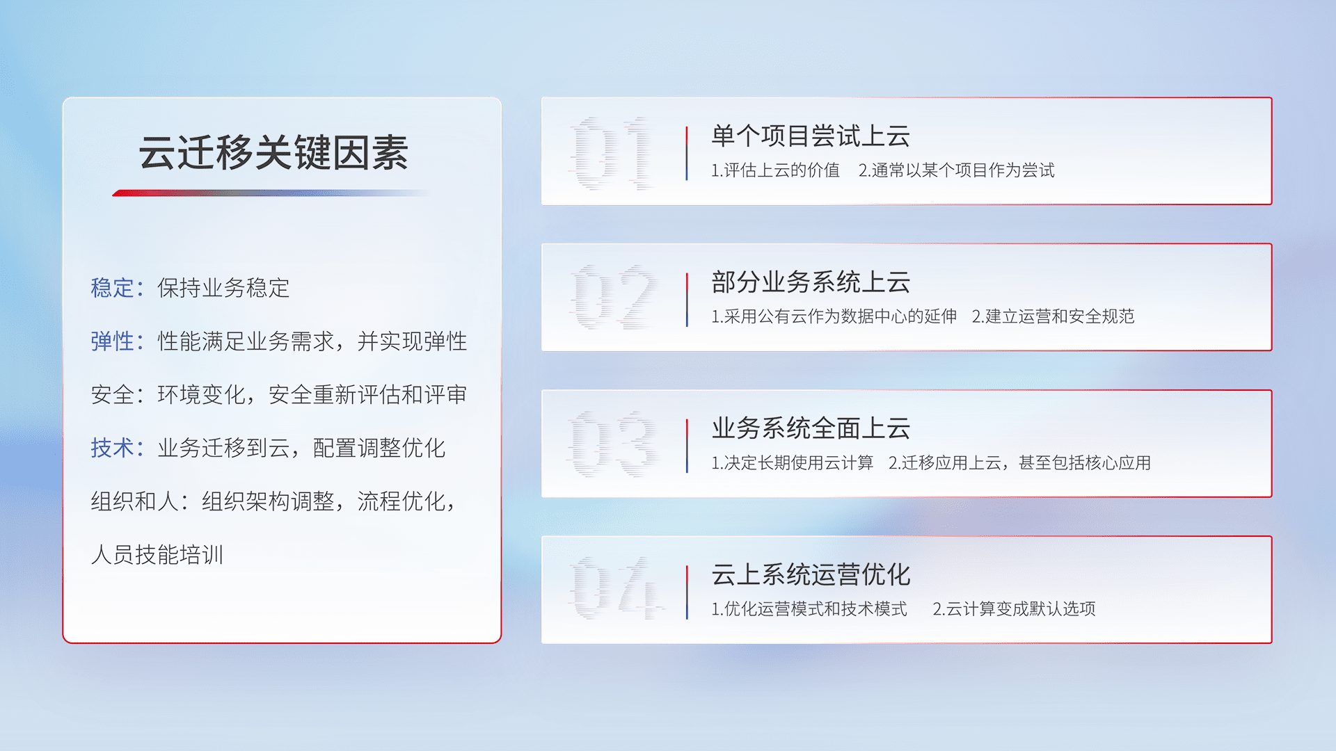 结合实际业务,,从规划设计、、云平台选型、、、、云原生改造、、数据迁移、、、、集成交付,,,,迁移全过程为客户识别最佳上云路径,,,做好风险识别管理,,设计网络架构、、、身份权限、、安全审计合规、、、、操作审计、、日志审计、、、监控告警策略、、、、多站点容灾设计等,,,对云上基础设施进行整体规划,,,提升IT治理水平,,以满足弹性、、高可用、、、、高性能的需求。。。