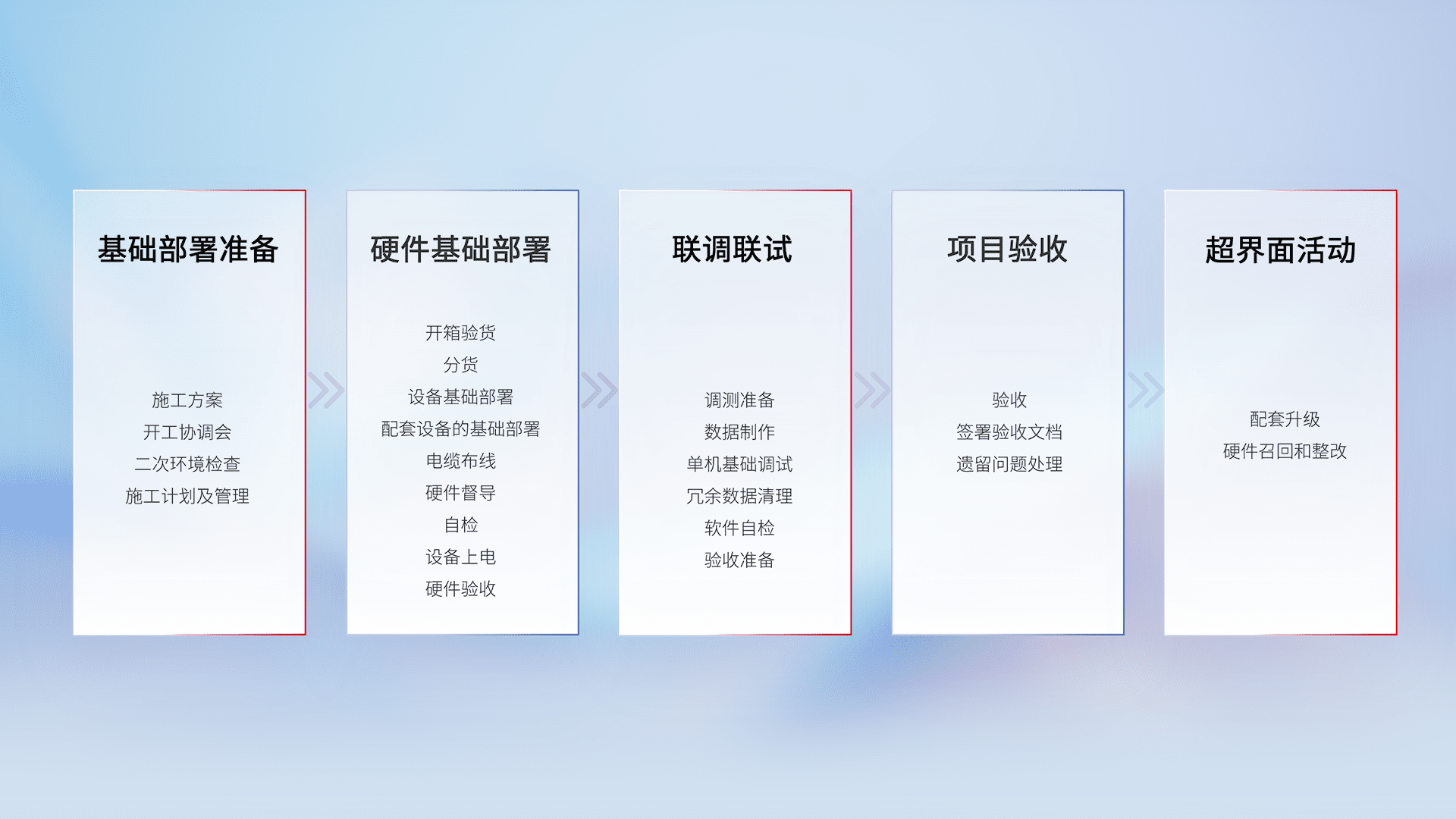从基础部署准备、、、、硬件基础部署、、、联调联试、、、项目验收、、越界面活动的全过程可追溯,,,,保证施工质量和进度。。。